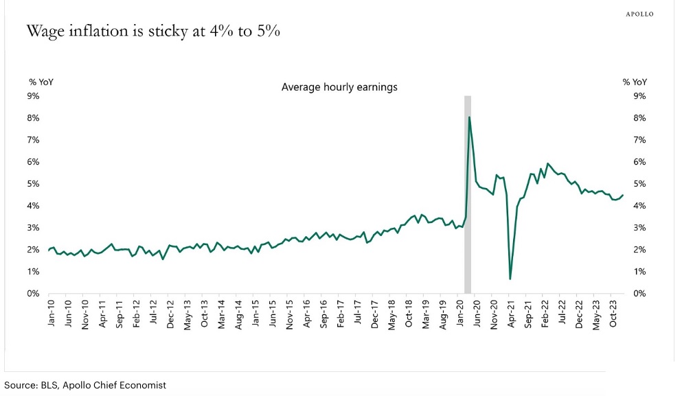 Sløk highlights the upward trend in measures of inflation, particularly emphasizing Fed Chair Powell’s preferred metric, supercore inflation. The tight U.S. labor market, low jobless claims, and persistent wage inflation between 4% and 5% reinforce the argument that the economy needs to ‘loosen’ before inflation rates can subside.